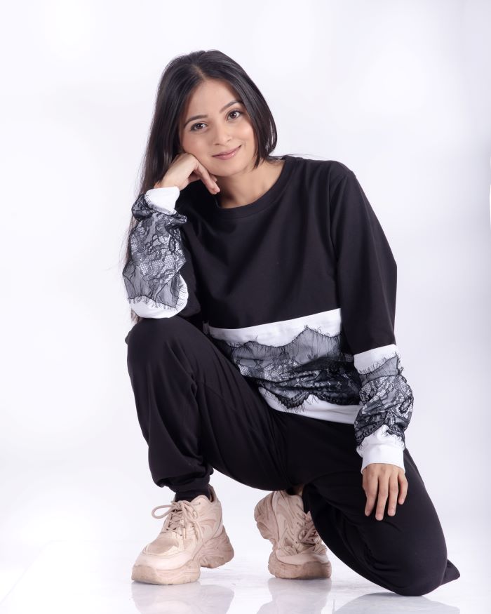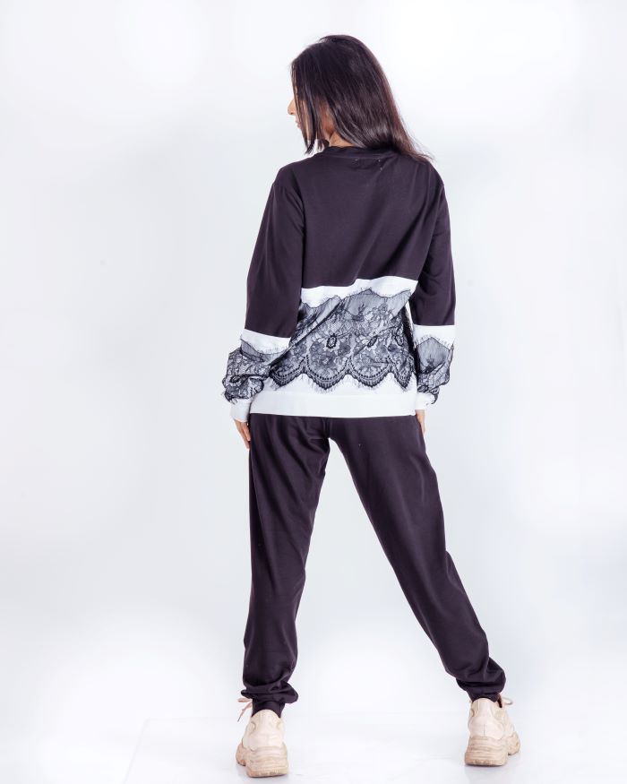 The top features an elegant lace panel accent that adds a subtle feminine touch to the minimalist design, balanced with contrast trims for a modern finish. Paired with comfortable straight-fit pants, this set seamlessly blends lounge comfort with street-ready appeal.