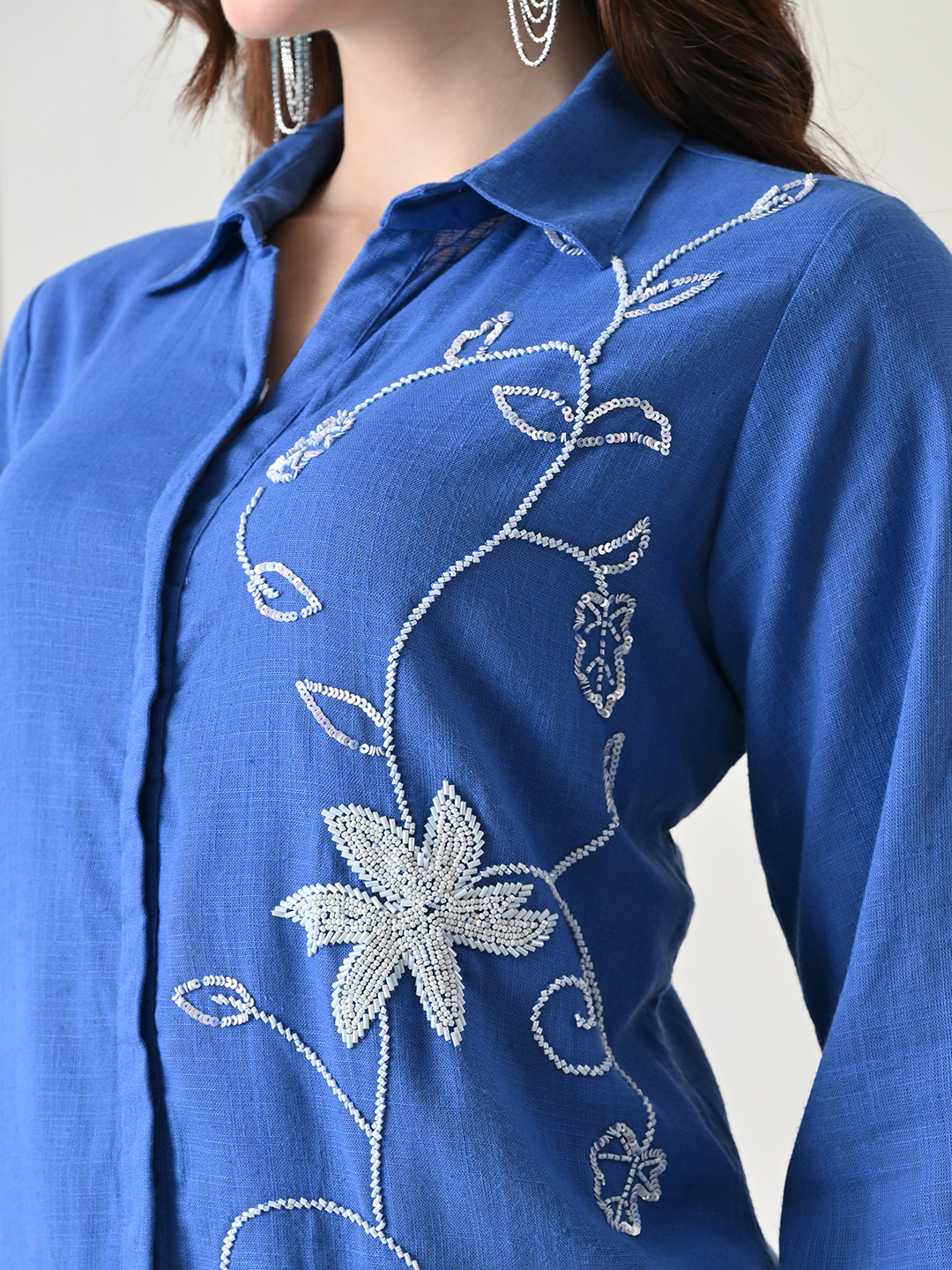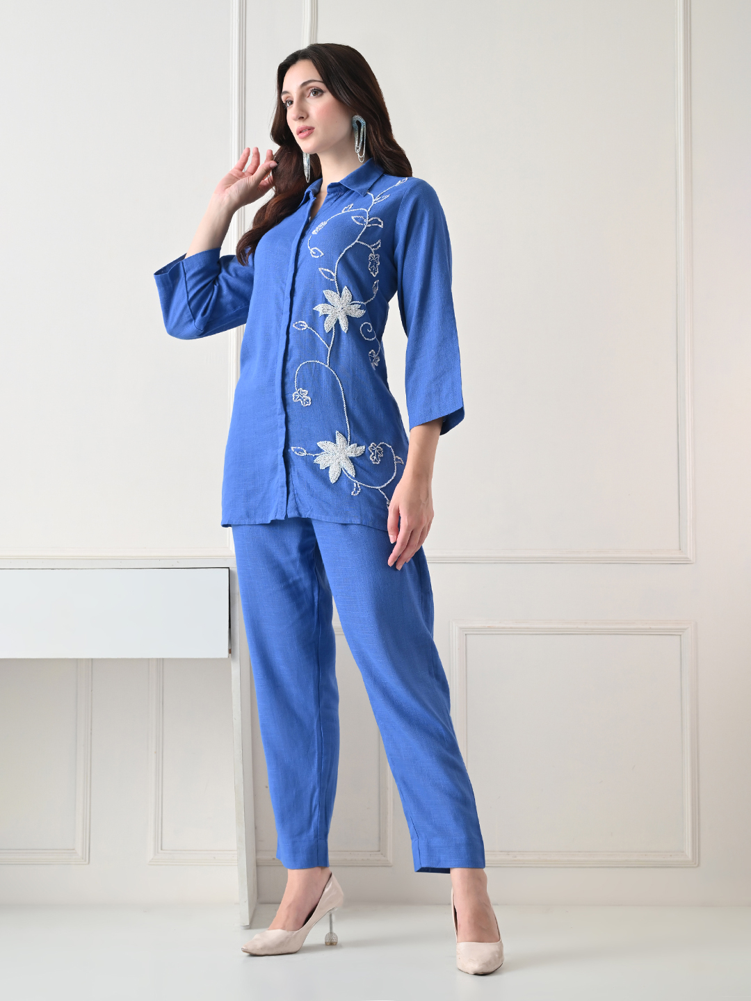 Elevate your everyday elegance with this refined black co-ord set crafted in breathable linen. The straight-cut tunic features a clean collared neckline and subtle front placket, enhanced with delicate contrast floral embroidery that adds a touch of understated charm. Paired with tailored straight-fit pants, this ensemble strikes the perfect balance between comfort and sophistication.