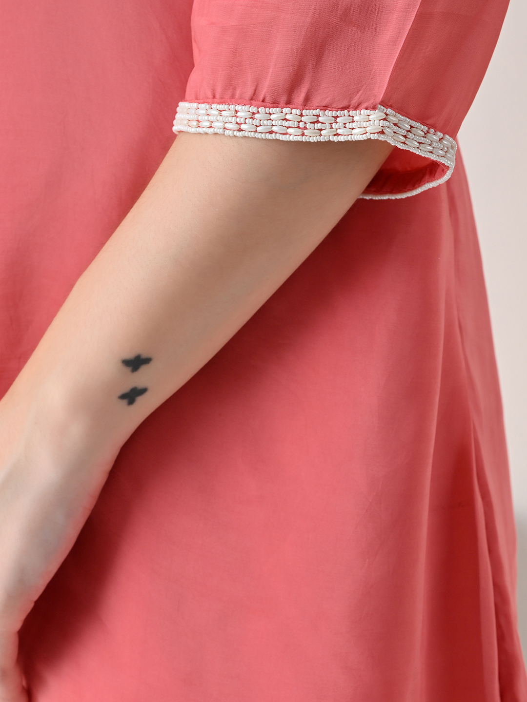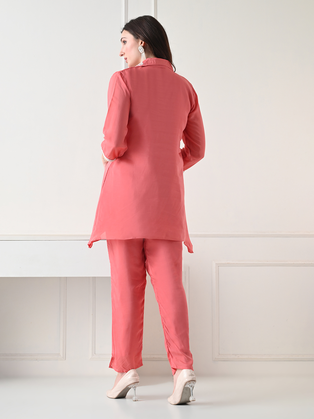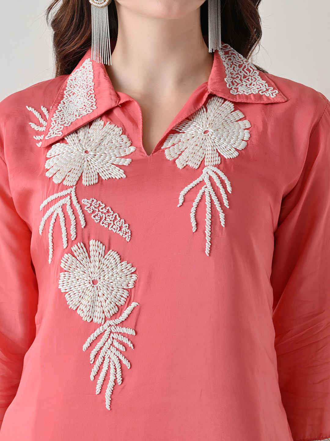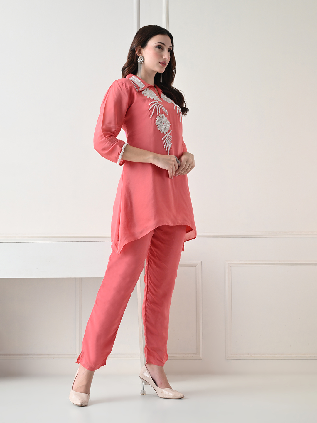 Co-ord set, crafted for effortless elegance. The collared kurta features delicate white floral embroidery , adding a touch of refined charm. Its asymmetrical hemline and 3/4th sleeves lend a contemporary twist to the traditional silhouette. Paired with straight-fit trousers, this ensemble strikes the perfect balance between comfort and style.