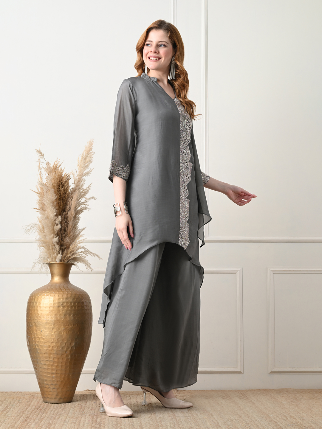 Make a chic statement with this olive green asymmetrical kurta set, blending traditional elegance with contemporary flair. The kurta features a flowy silhouette with a high-low hemline, accentuated by intricate geometric embroidery along the front panel. Designed with full sleeves and paired with wide-legged palazzo pants.