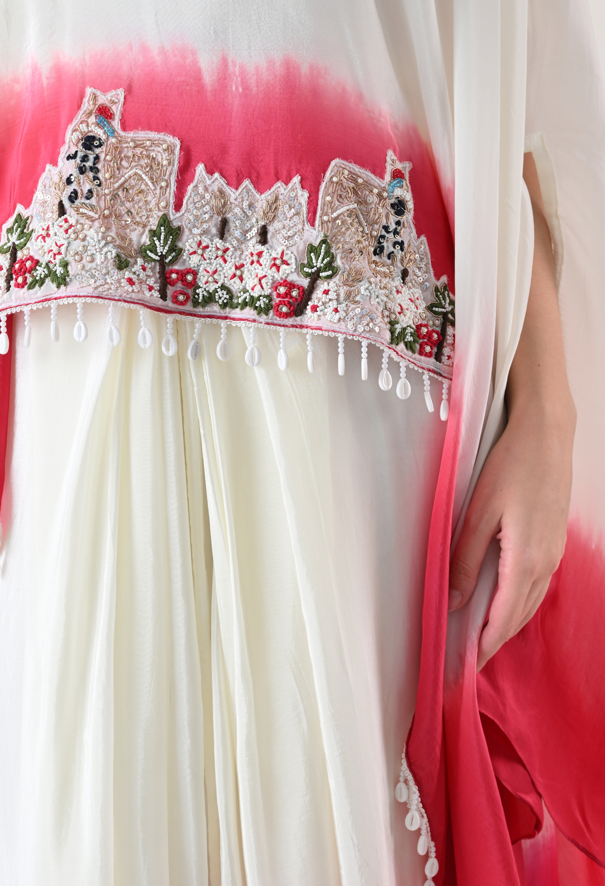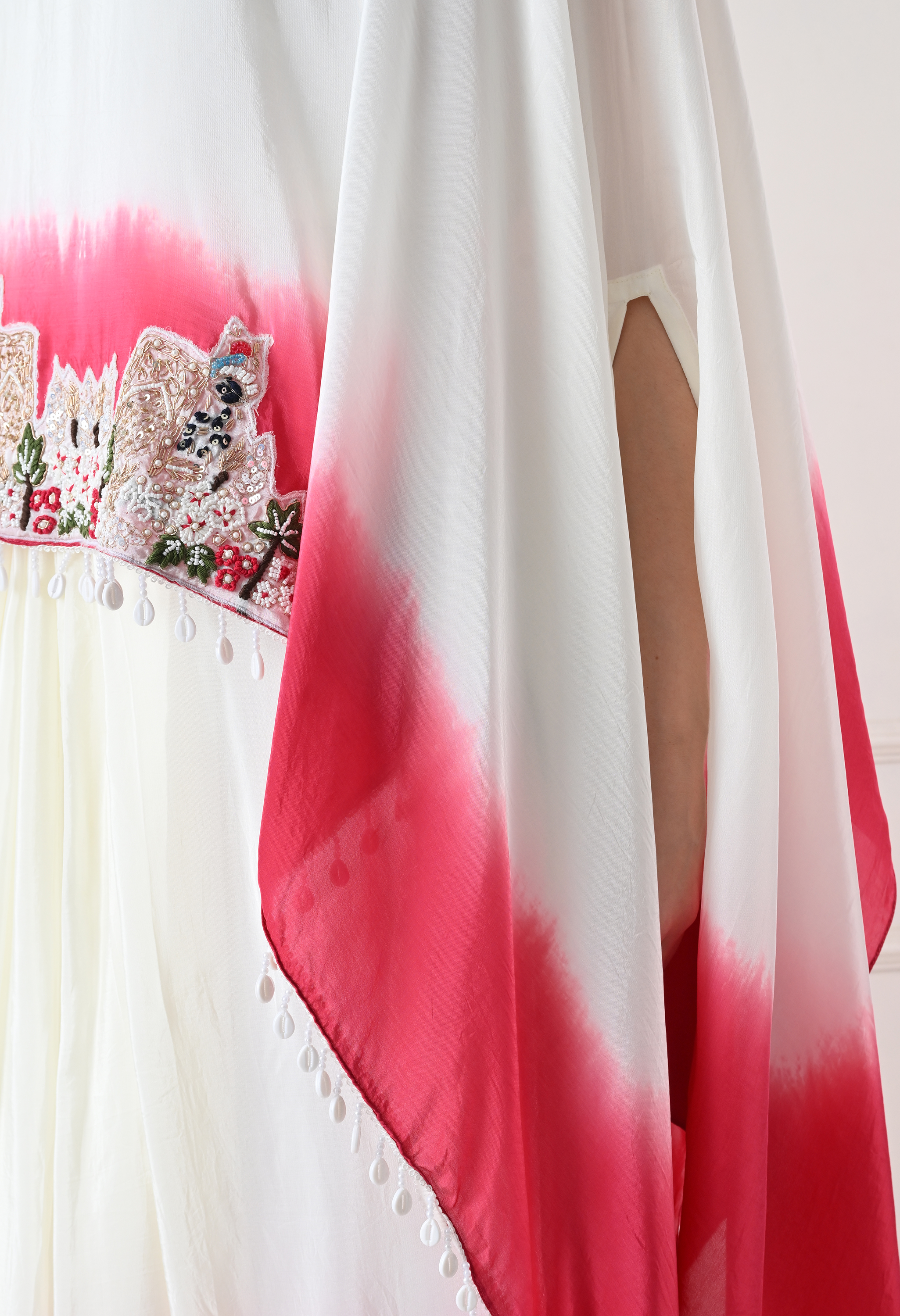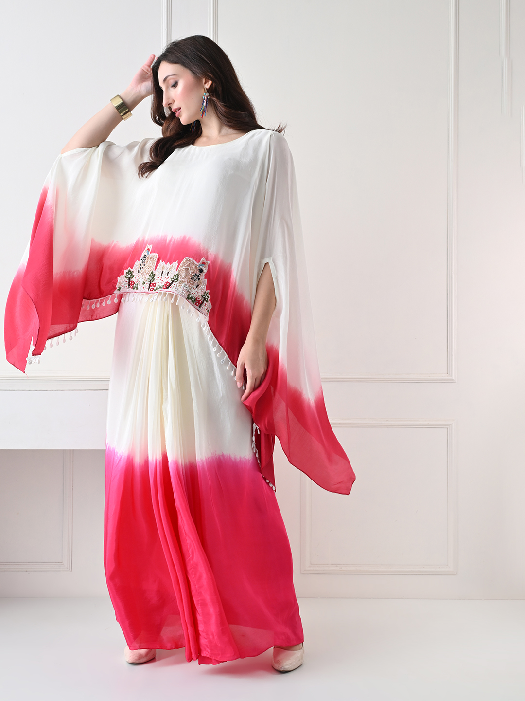 Grace meets statement style in this ethereal ivory and fuchsia ombre kaftan set. Crafted in a fluid, lightweight fabric, the ensemble features a beautifully draped skirt paired with a flowy kaftan-style overlay that creates effortless movement and elegance.