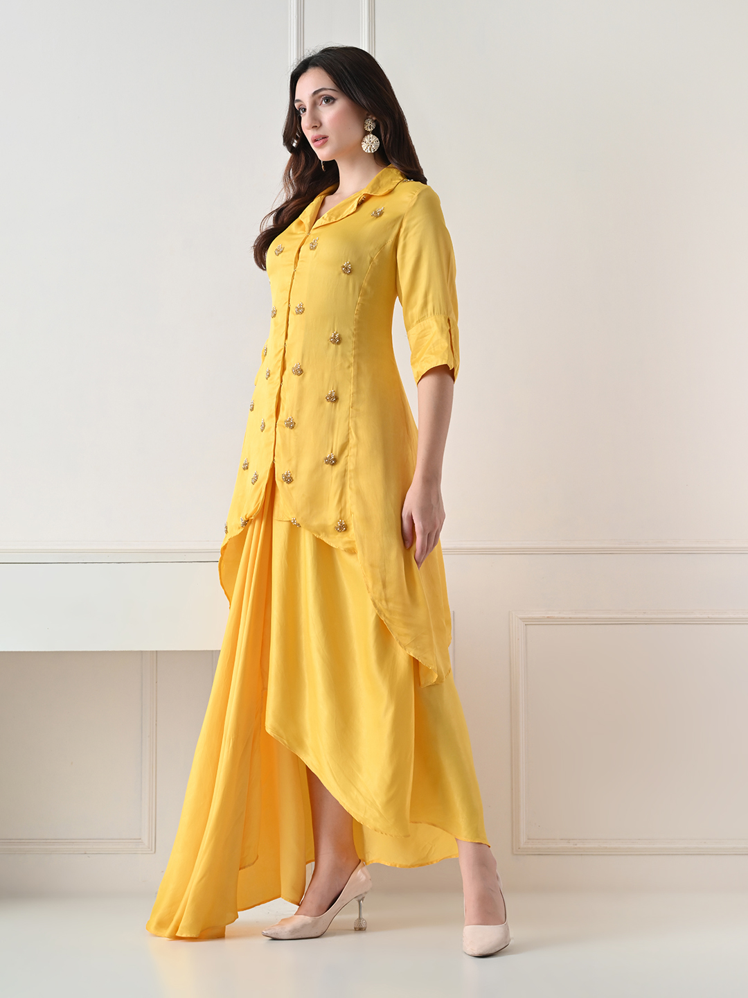 Bright, graceful, and effortlessly chic—this sunshine yellow draped kurta set is designed to make a statement with ease. Crafted in a fluid, lightweight fabric with a soft sheen, the ensemble features a layered kurta with a contemporary asymmetrical hemline, paired with a beautifully draped skirt for a flattering, flowy silhouette.