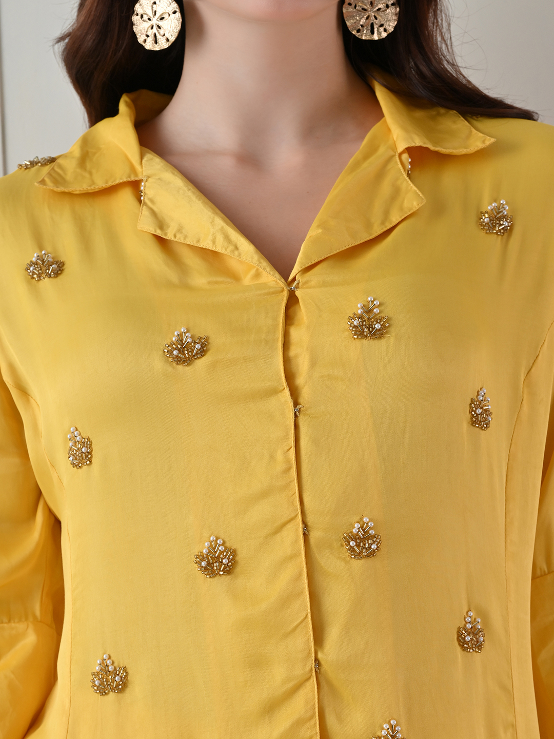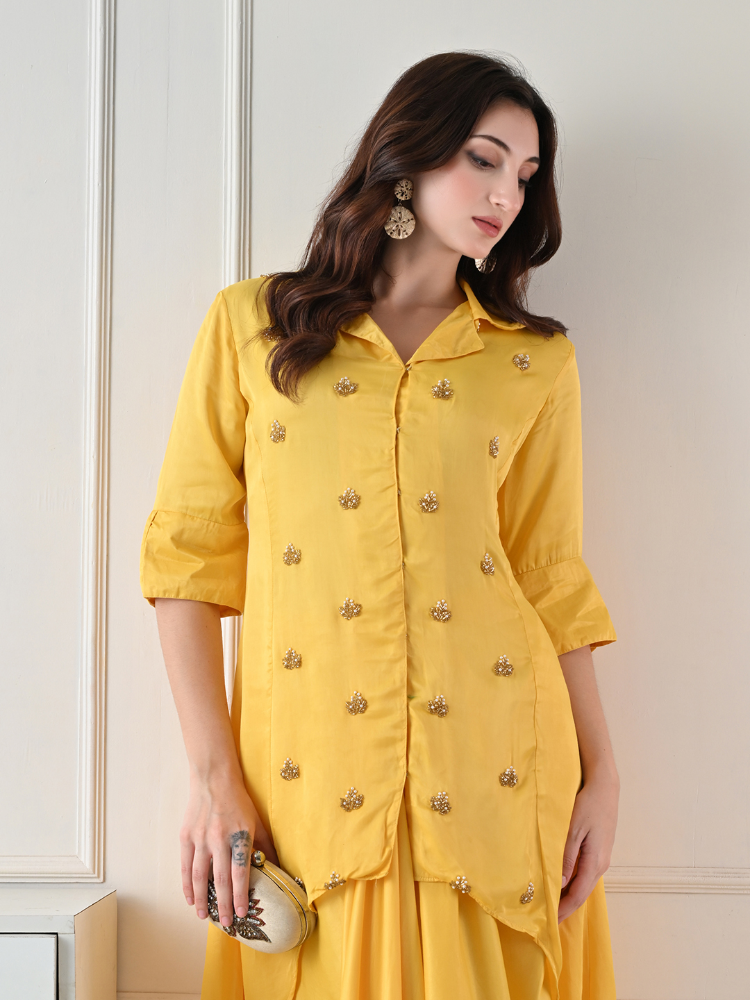 Delicate hand-embellished motifs are scattered across the kurta, adding a subtle festive sparkle, while the structured collar and button-down front lend a modern edge. The vibrant yellow hue brings freshness and warmth, making it perfect for daytime celebrations, festive gatherings, or intimate occasions.