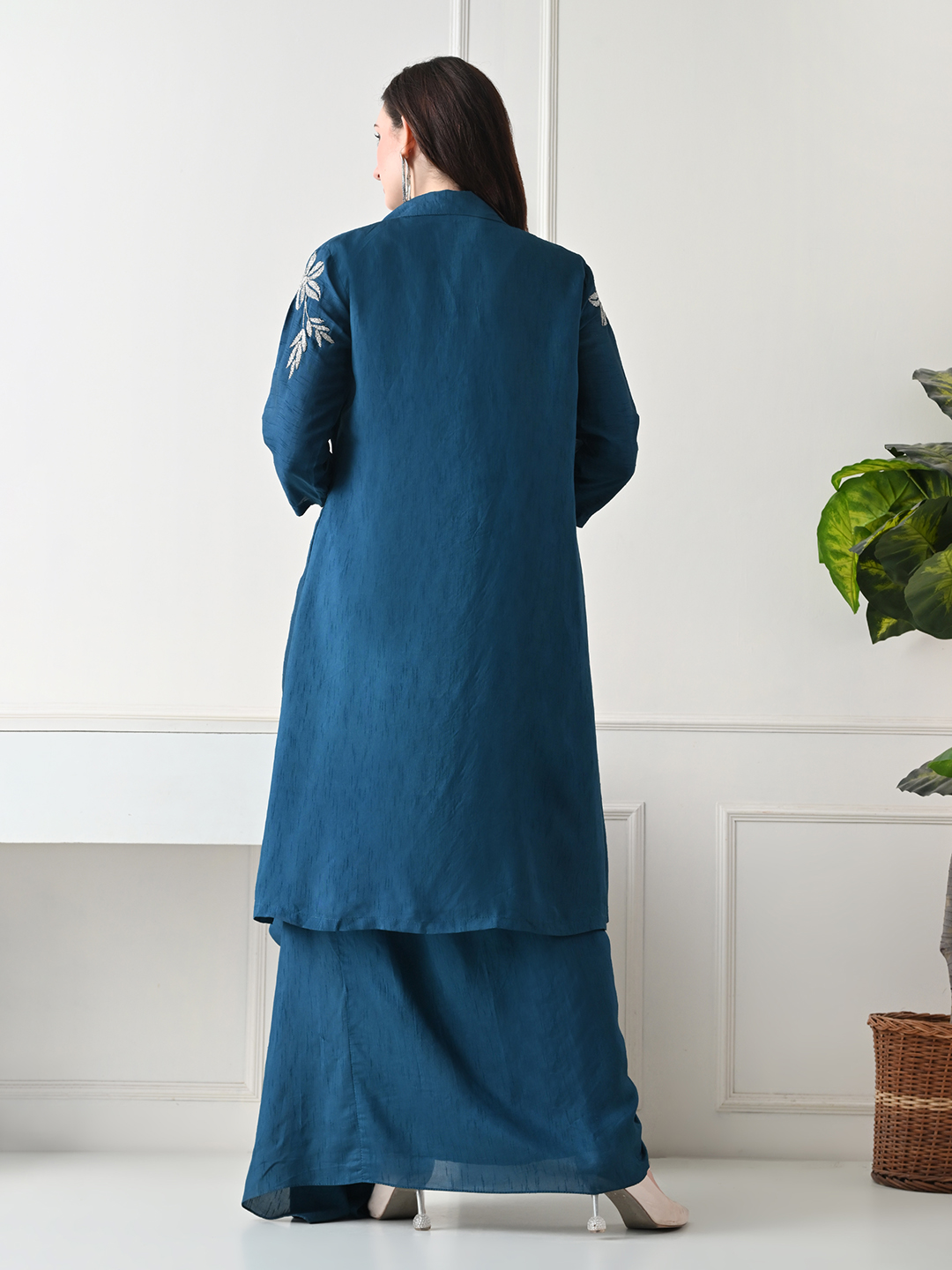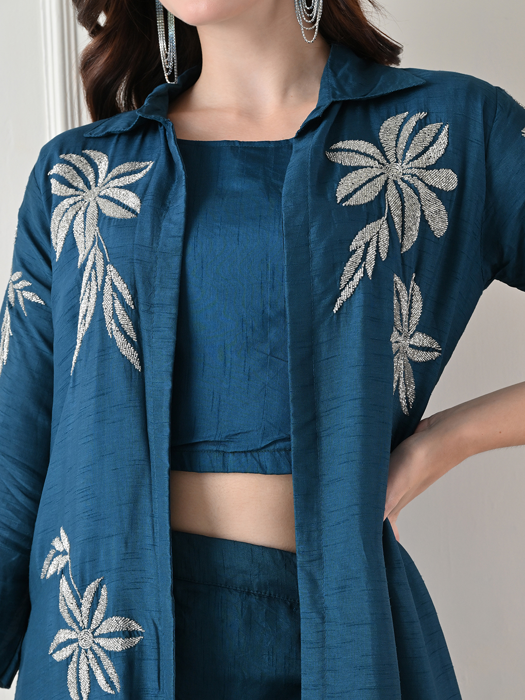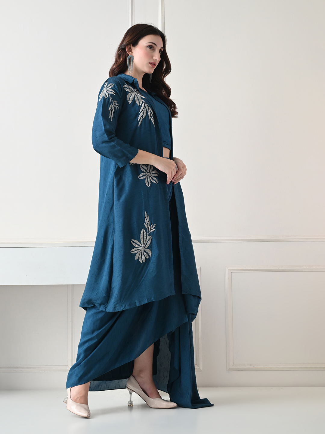 A statement in modern elegance, this teal three-piece fusion set blends contemporary silhouettes with delicate craftsmanship. The ensemble features a structured crop top paired with a fluid draped skirt, layered with a long open-front jacket adorned with intricate floral embroidery.
